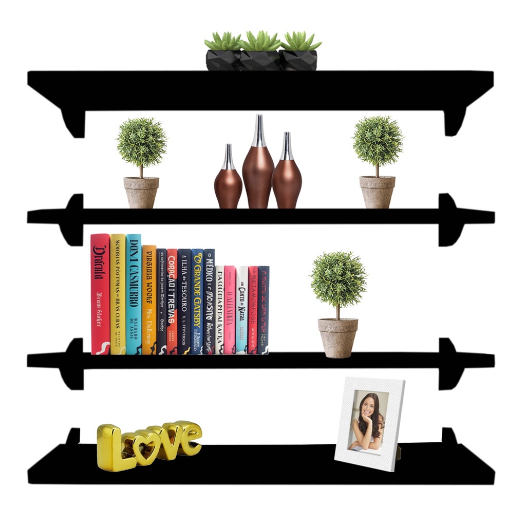 Kit Jogo 4 Prateleiras De Parede De Livros Decorativas Branca E Preta 30x15 Sala Quarto Banheiro