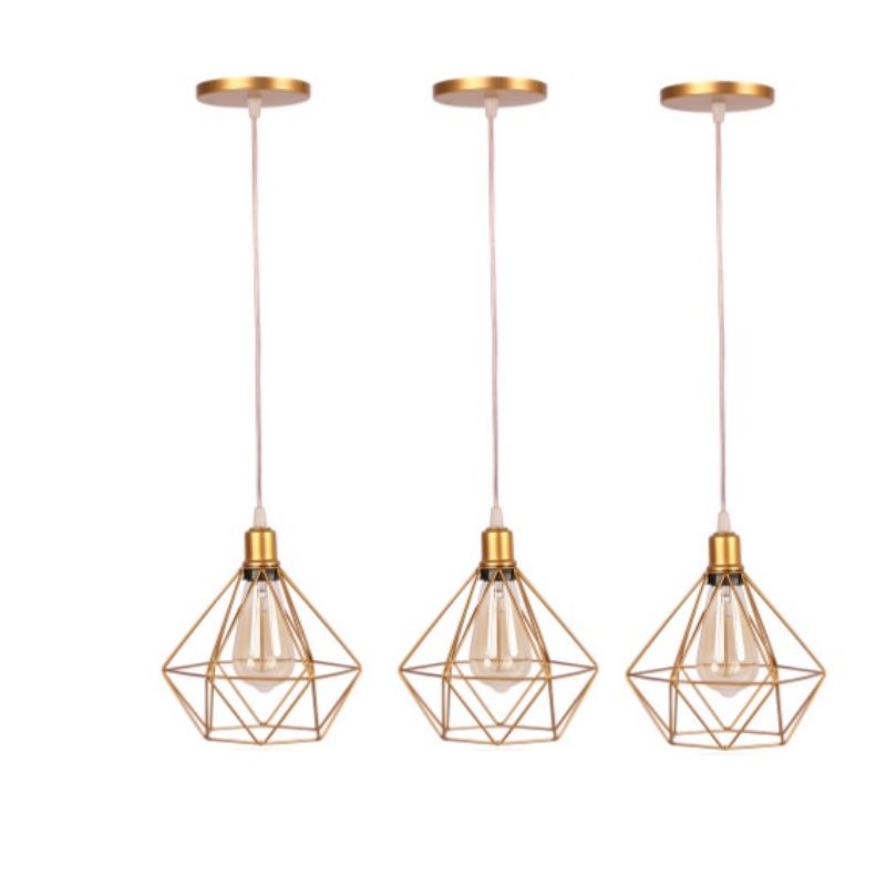 kit3 Pendente Diamante Lustre Luminária de Teto Retrô Dourado Cabo Cristal