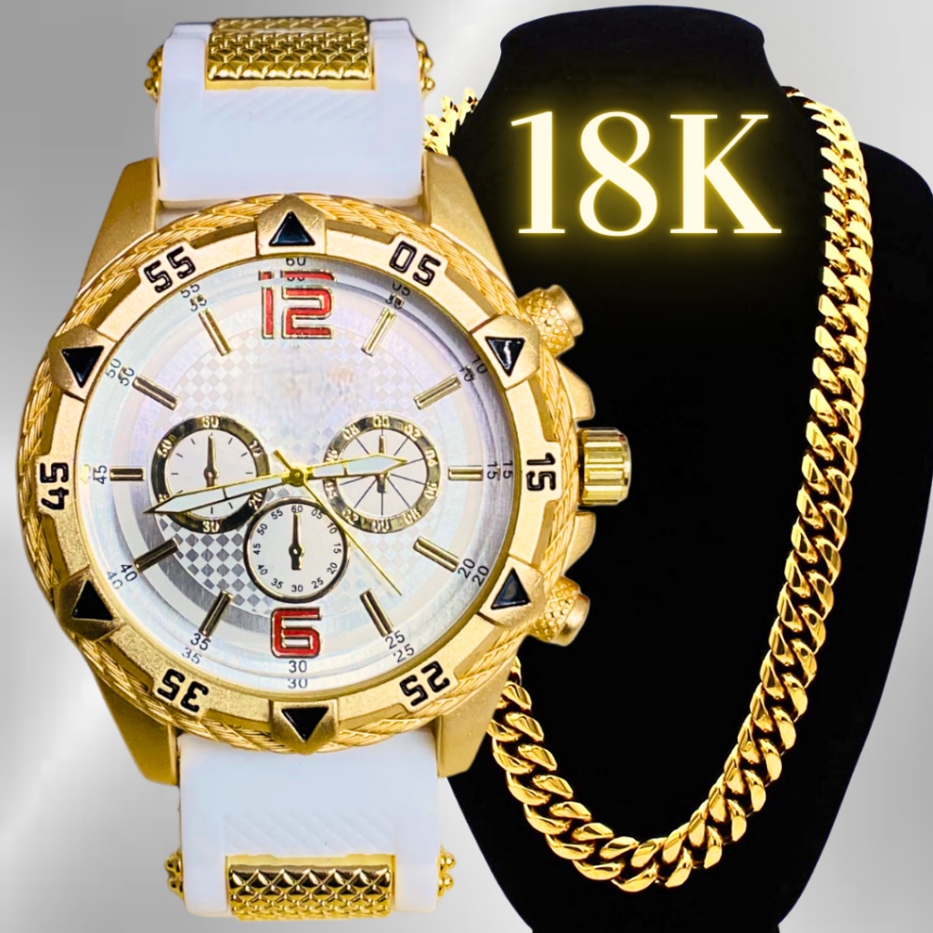 Kit Relógio Masculino Dourado + Corrente Banhada Grossa 18k