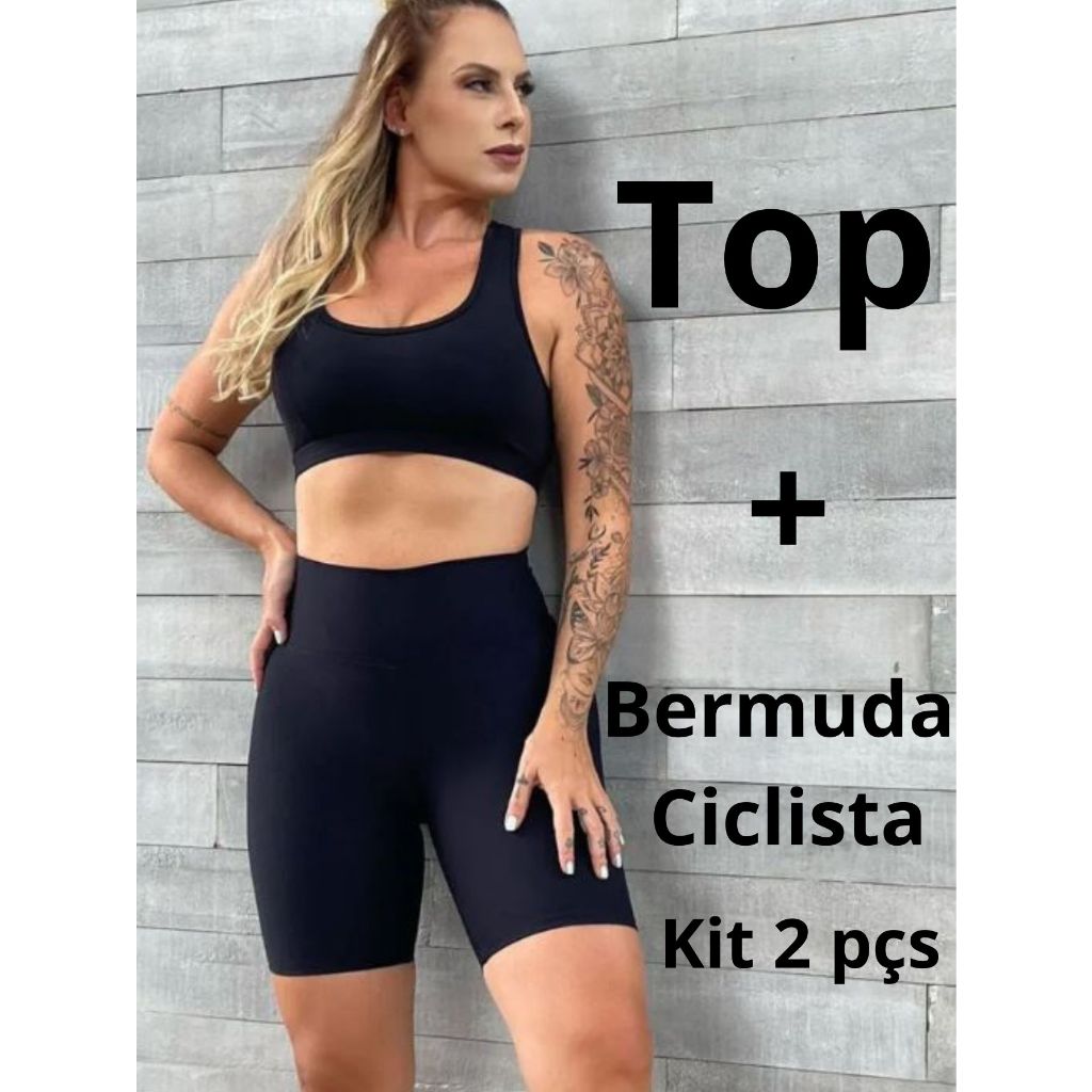 Conjunto Academia Top e Bermuda Ciclista Suplex Fitness do P ao G1 Promoção