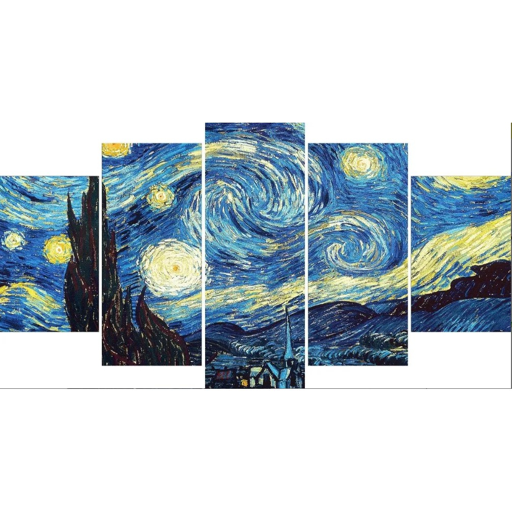 Kit Quadros Decorativos Mosaico 5 Peças Van Gogh Arte Modular Abstrato Noite Estrelada Igreja Traços