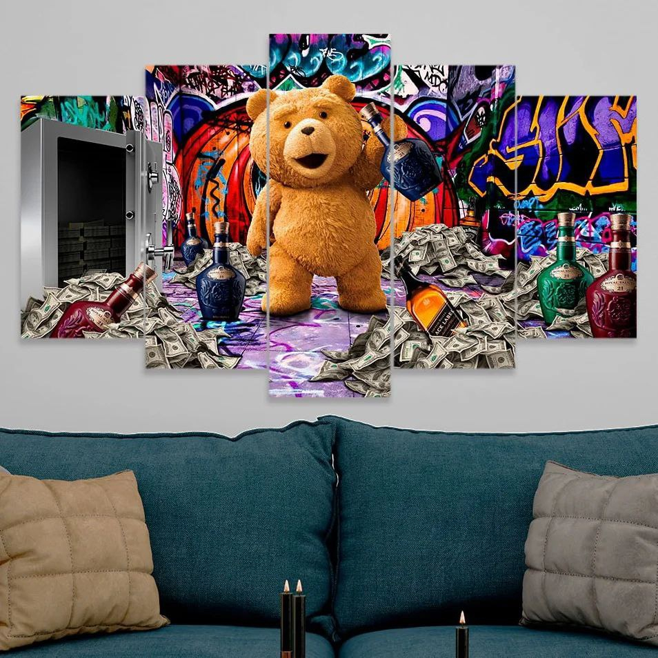 Kit Quadros Decorativos Mosaico 5 Peças Urso Ted Ostentação Dinheiro Mala Cofre Arte Whisky Luxo