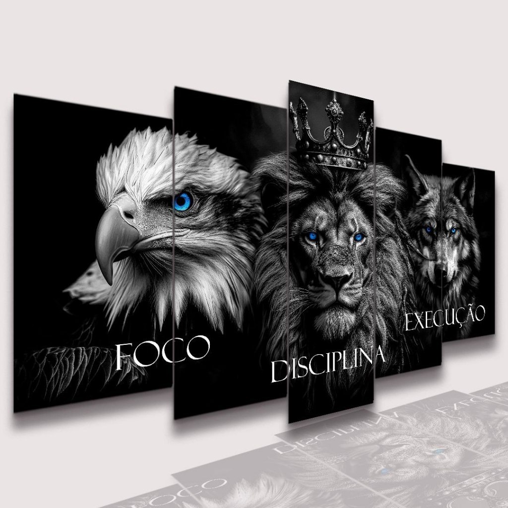 Kit Quadros Decorativos Mosaico 5 Peças Frase Motivação Foco Disciplina Execução Animais Leão Águia Lobo Olhos Azuis Modular Luxo Vintage Preto Branco