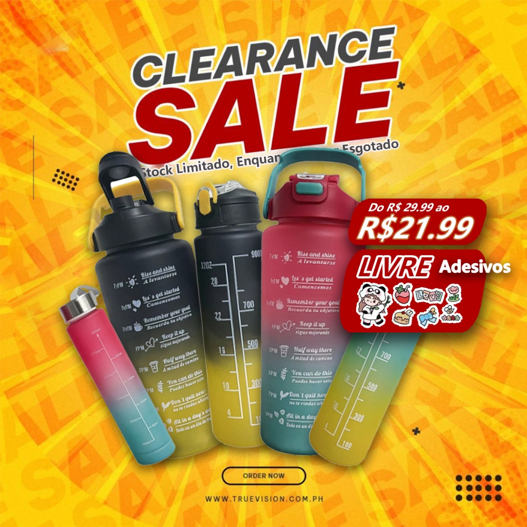 Kit 3 em 1 Garrafa Agua Squeeze Galão Com Adesivos Lembretes Beber Agua - ENVIAMOS COR ALEATORIA