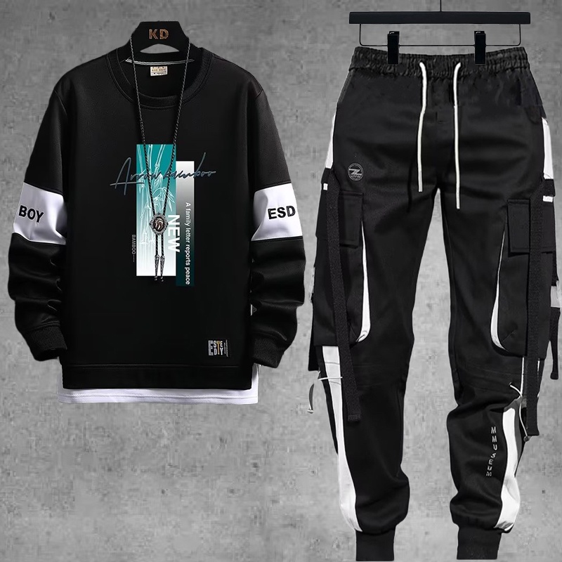 Camisa De Suor Confortável Para Homens Pescoço Redondo De Manga Longa + Calça De Carga Hip-Hop Joggers Preta Outono E Inverno 2023 Novo Estilo