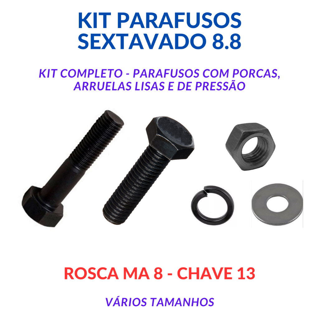 Parafuso Sextavado Aço 8.8 - (Chave 13) MA 8 Passo 1,25 - kit com porcas, arruelas lisas e de pressão - vários tamanhos