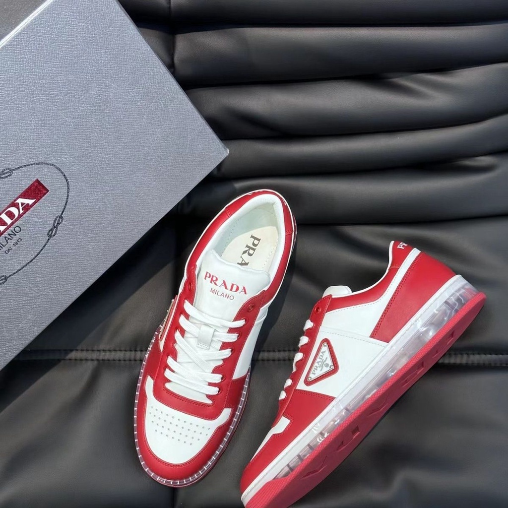 Prada Novo padrão triangular de costura de couro integral respirável Esportes de baixa ajuda com sola grossa Sapatos casuais masculinos Sapatos de prancha (Um pé)