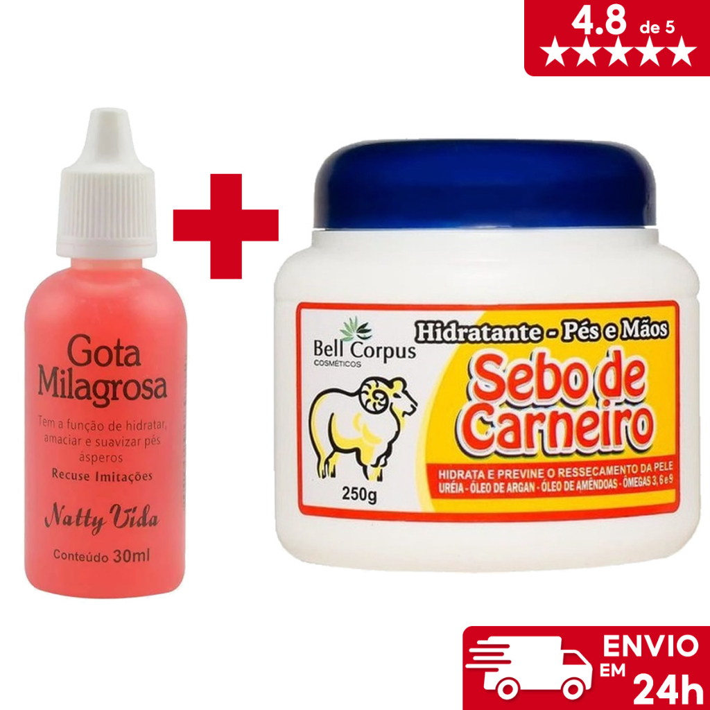 Kit Hidratante Para os Pés Sebo de Carneiro + 2 Gota Milagrosa - Combate Rachaduras, Ressecamento