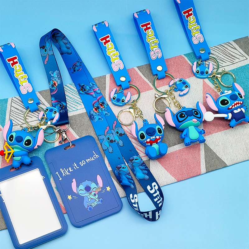 3 em 1 Stitch titular do cartão dos desenhos animados com cordão chaveiro figura 3D chaveiro estilingue decoração estudante carteira de ônibus caso protetor