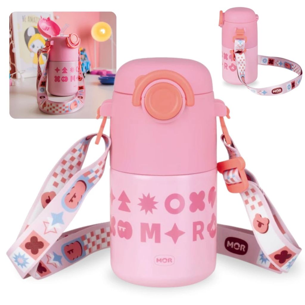 Garrafa Térmica Infantil Kids Rosa 500 Ml em Aço Inox com Alça e Canudo em Silicone Ilustrada Escolar Mor