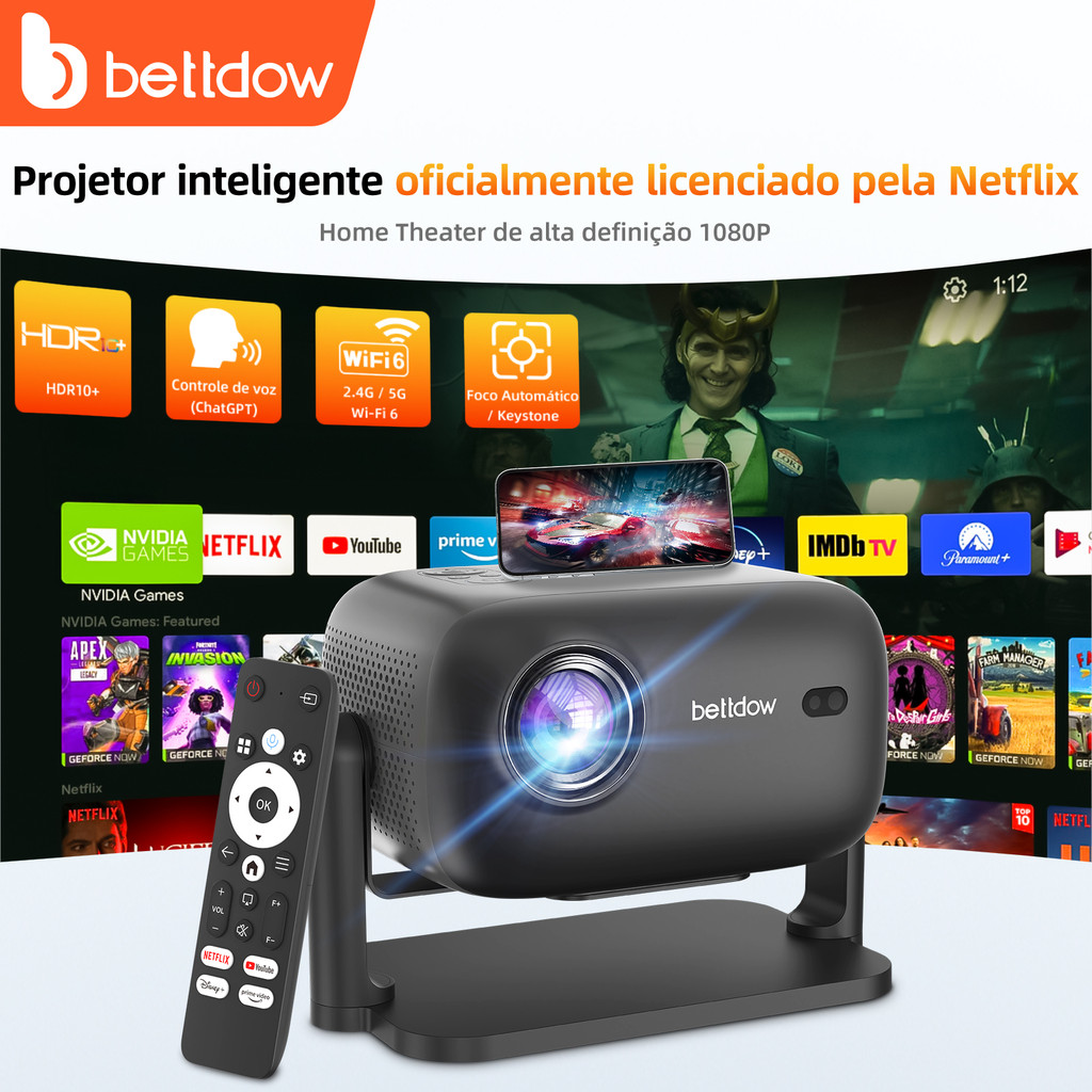 BETTDOW Mini Projetor para Telefone 4K Ultra HD 1080P Tela de Laptop Android ios Bluetooth Netflix WiFi