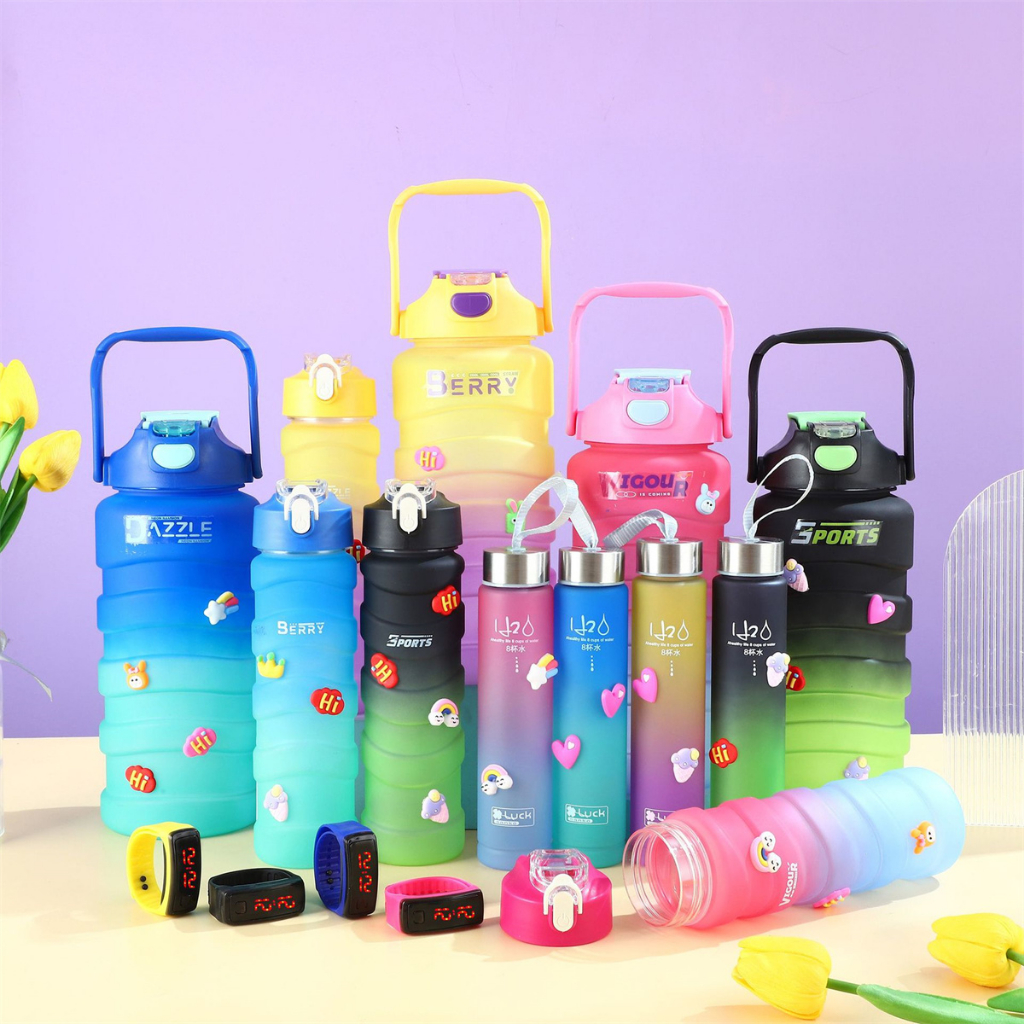 Kit Garrafas 3 em 1 garrafas 2L 900ml 300ml Squeze Academia Treino Tie Dye com 3D adesivos