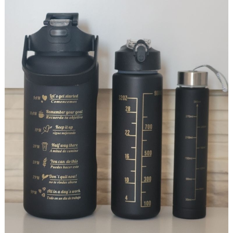Kit Garrafa Motivacional 3 em 1 Adesivo 3D 3 Garrafas Água Squeeze Antivazamento Alça Galão Canudo 2l Litros + 900ml + 300ml Academia Fitness Tie Dye Preta Frases em Português