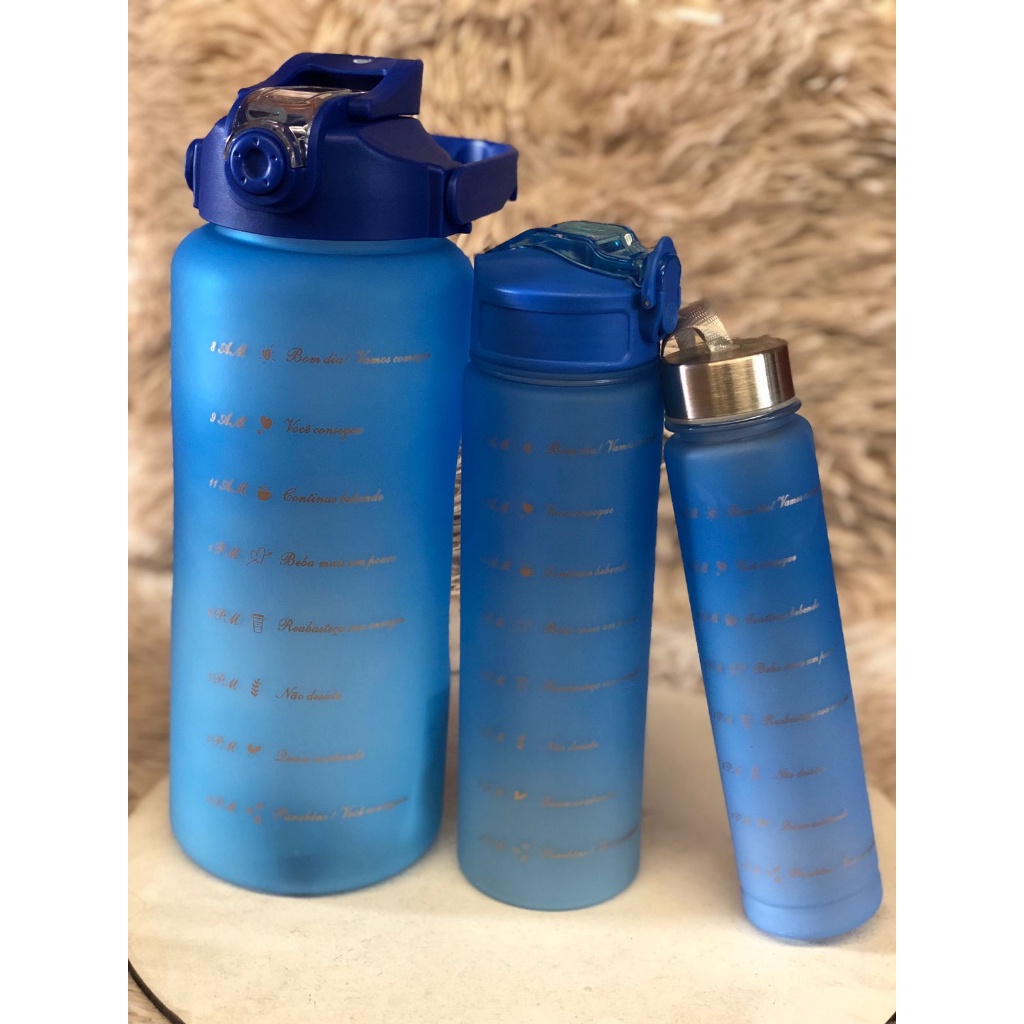 Kit Garrafa Motivacional 3 em 1 Adesivo 3D 3 Garrafas Água Squeeze Antivazamento Alça Galão Canudo 2l Litros + 900ml + 300ml Academia Fitness Tie Dye Azul e Laranja Frases em Português