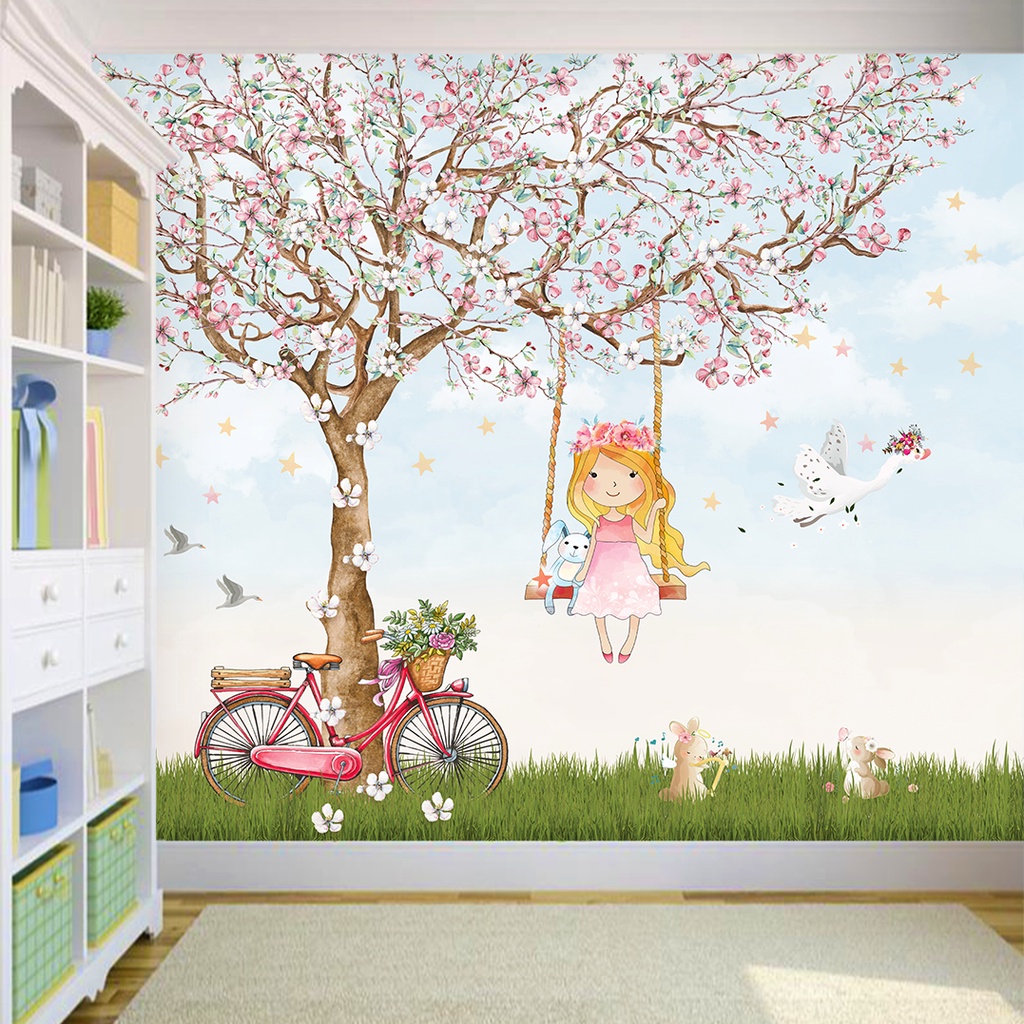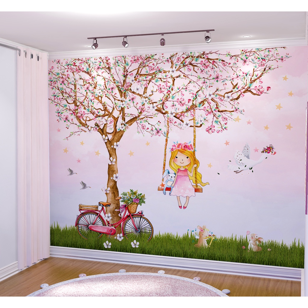 Papel de Parede Infantil Menina no Balanço Árvore de Flores Decora Quarto Rosa m²