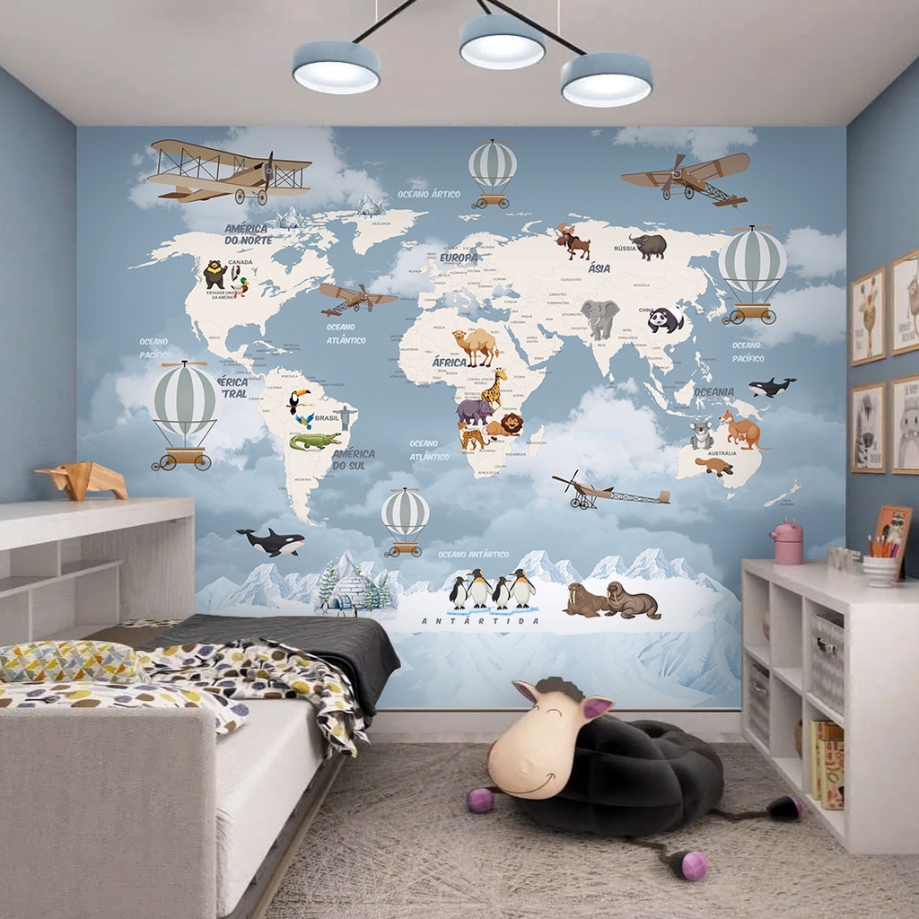 Papel de Parede Autocolante Tema Safari Mapa Mundi Quarto de Menino e Menina m²