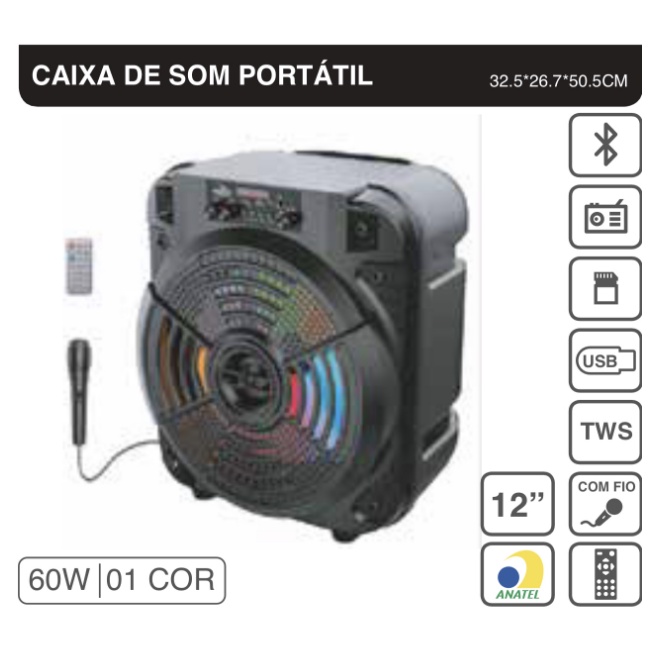 Caixa de som Grande 60W Com Microfone,LED Colorida E Controle GRASEP D-BH12113
