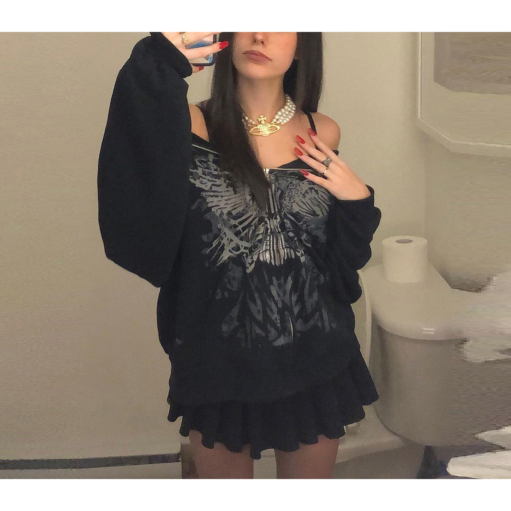 2024 Novo Estilo Borboleta Casual Solta Retro Impresso com Zíper Impresso com Capuz de Manga Longa Casaco Cardigan Mulher