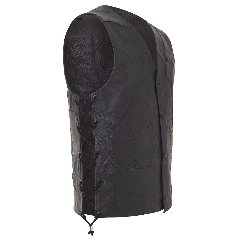 Colete Em Couro Legitimo Bovino Retalhado Com Fechamento Em Botão Preto Motoclube