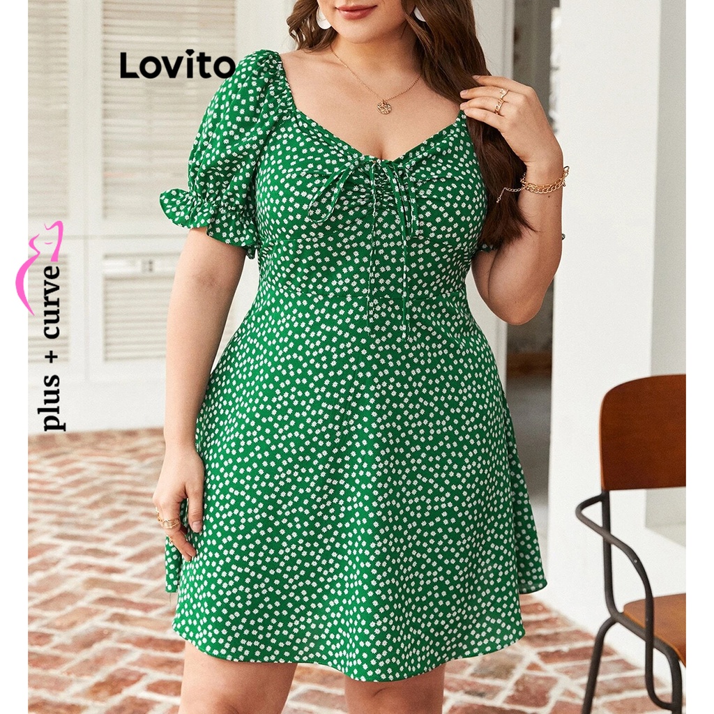 Lovito Vestido Feminino Plus Size Curve Boho Ditsy Floral Padrão Com Cordão LBE05153 (Verde)