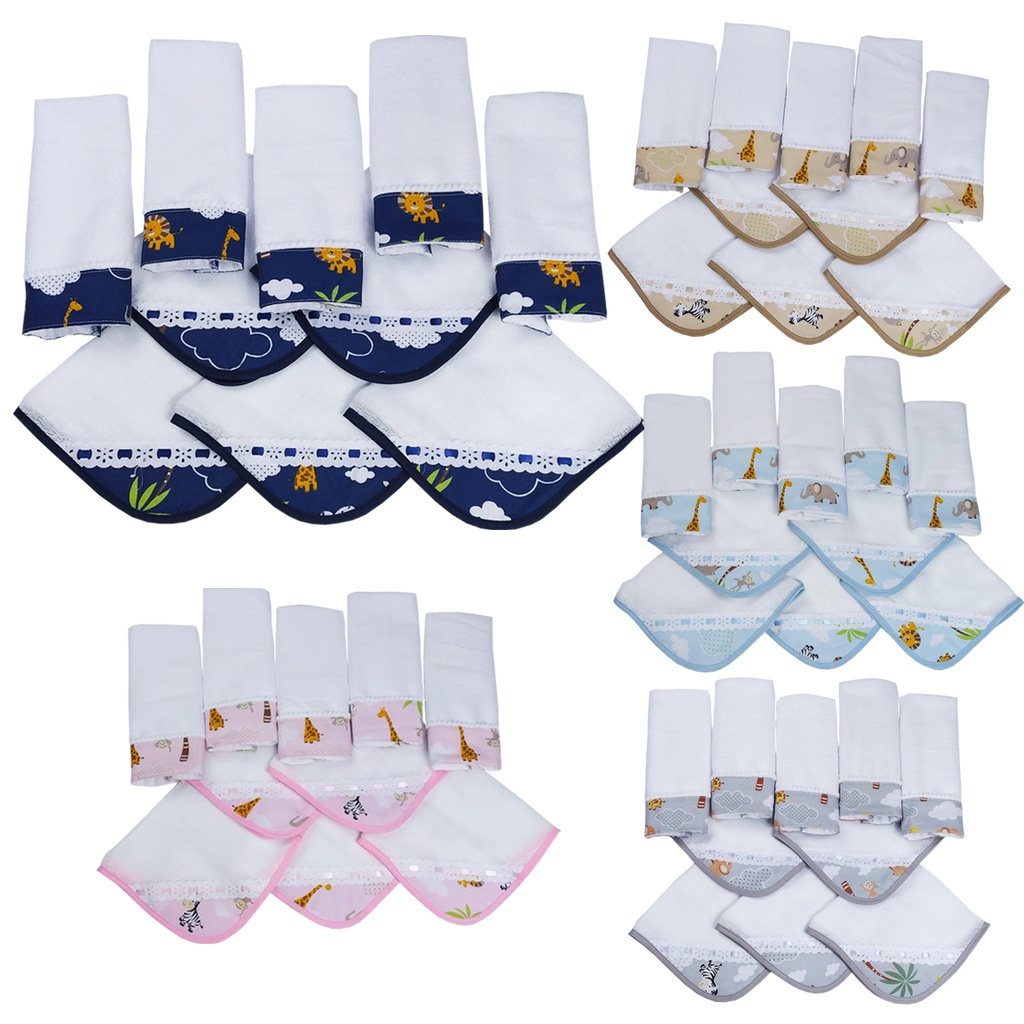 Kit 5 Fraldinhas de Boca + 5 Toalhinhas de Ombro Estampas Safari com Tecido Estampado 100% Algodão Meninos e Meninas Pronta Entrega