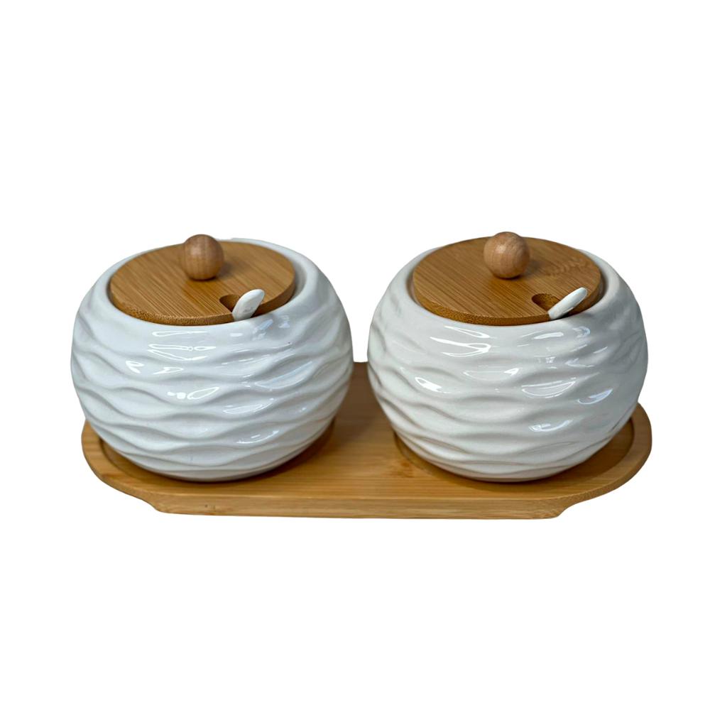Kit 2 Porta Condimento Colher Cerâmica Bandeja e Tampa Bambu