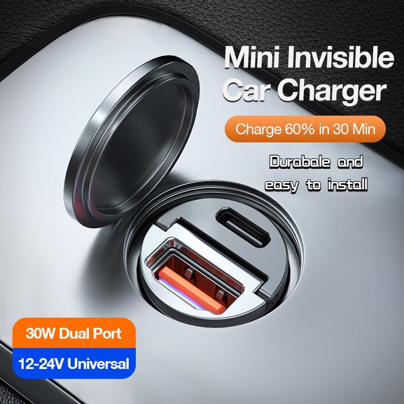 Mini Carregador De Rápido Invisível Para Carro 60W USB Tipo C PD30W + QC3.0 Dual Porto Metal Carga Rápida Compatível Com Smartphone iPhone 13 12 11 Pro Max iPad Samsung Huawei