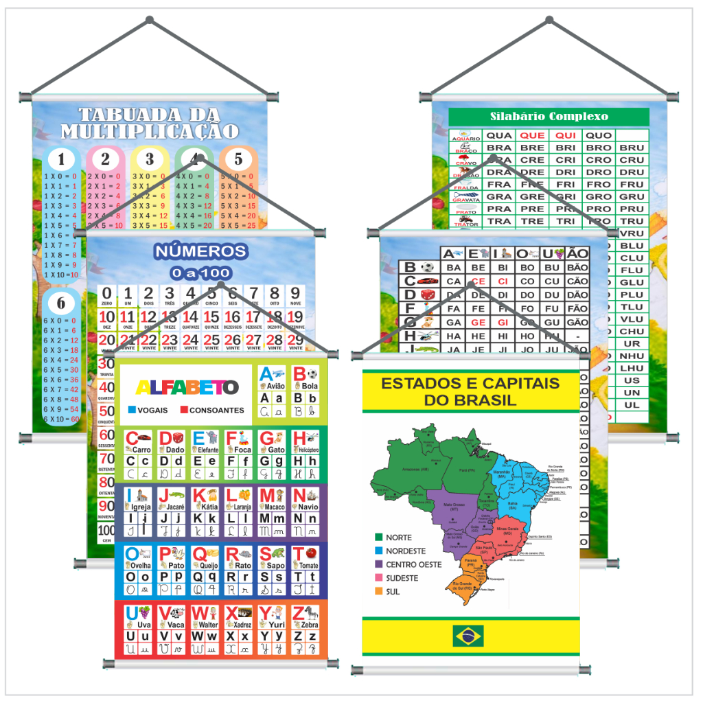 Kit 6 Banners Sílaba Simples Complexa Alfabeto Números Tabuada Mapa Pedagógico Escolar