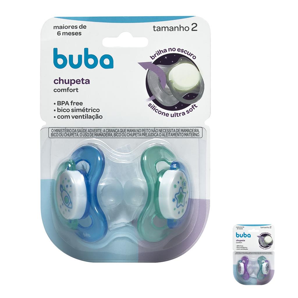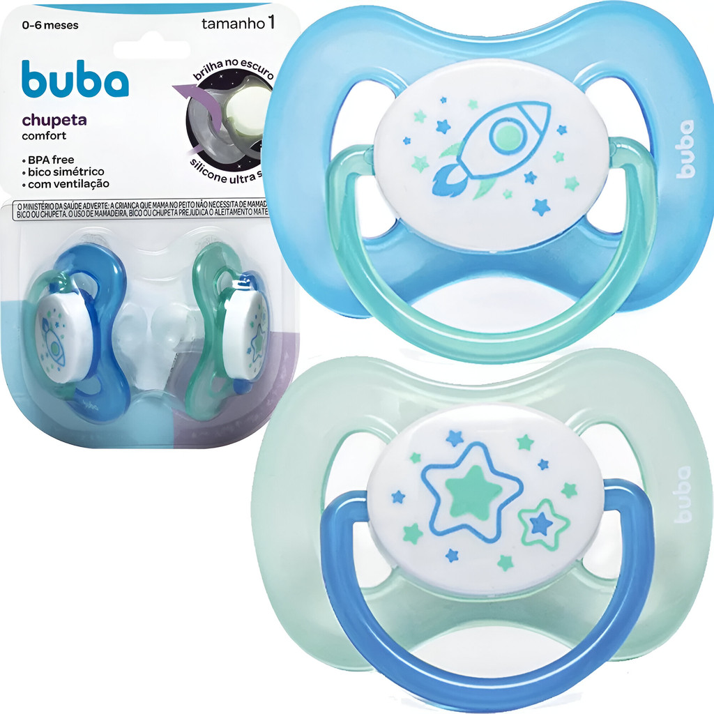 Kit 2 Chupetas Silicone Confort Ultra Soft +0 Meses Tamanho 1 e 2 Brilha No Escuro Bebe Azul Buba