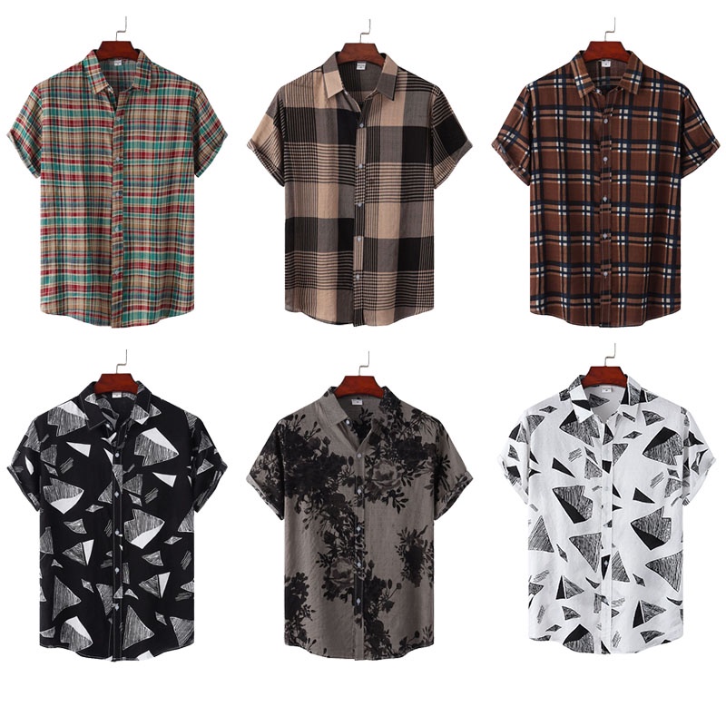 2022 Novas Listras Masculinas Estampa Geométrica Manga Curta Havaí Praia Casual Loose Botão up Camisa De Lapela Plus Size