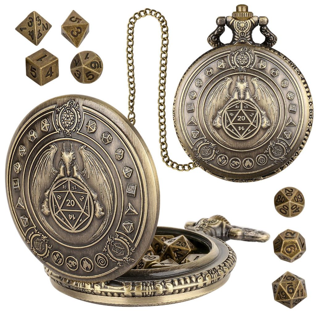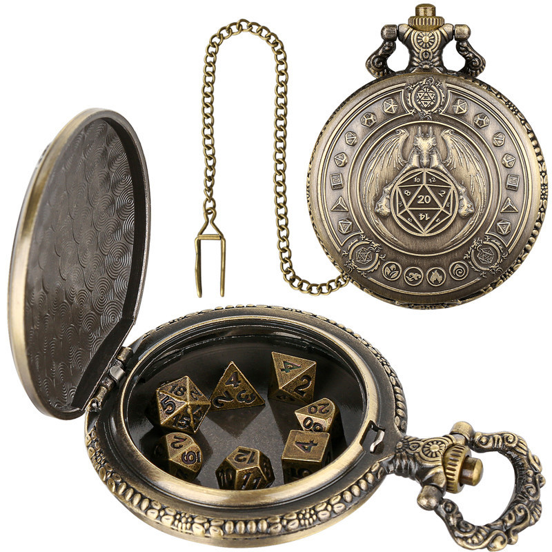 Conjunto de Dados de Metal Poliédrico Bronze, Minúsculo e Gravado com Asas de Dragão, Caixa de Relógio de Bolso com Cadeia para Masmorra, Jogo de Tabuleiro, Dragões, Pathfinder, D&D e RPG