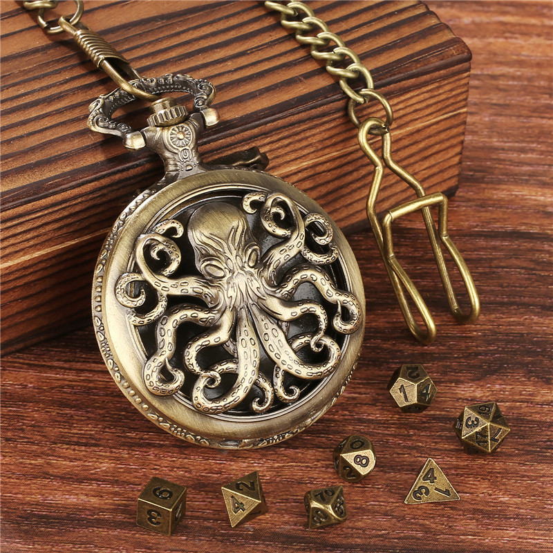 Conjunto de 7 Dados Poliédricos de Metal em Bronze com Caixa Oca de Polvo, Relógio de Bolso e Corrente para Jogos de RPG