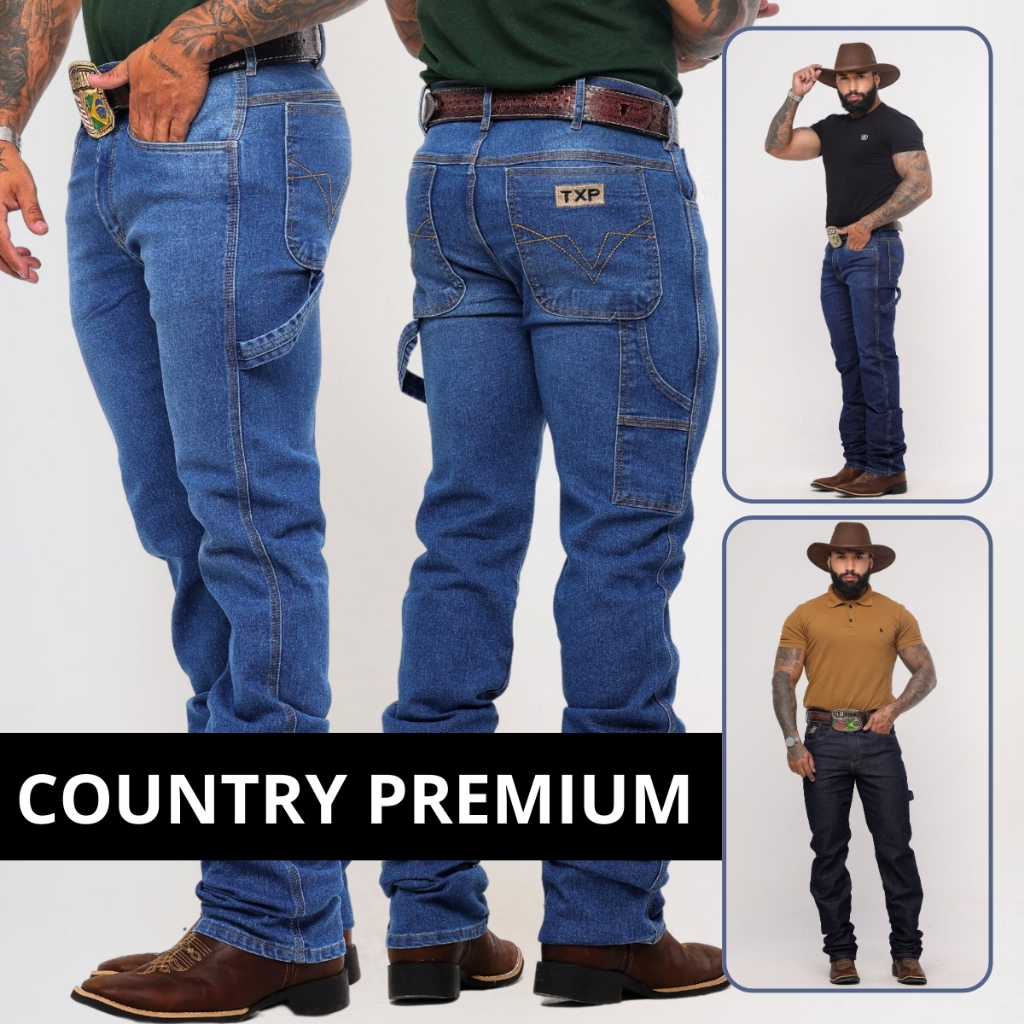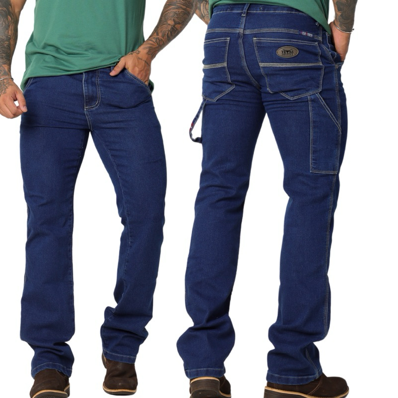 Calça Jeans Masculina Country Carpinteira Premium Rodeio com Elastano Tecido Grosso Texas Resistente