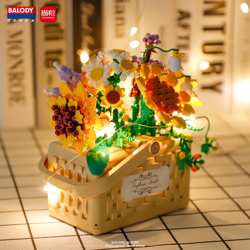 Flor Rosa Girassol Com Bloco De Iluminação Cesta De Tijolos Construção Tijolo Decoração Brinquedos 21071