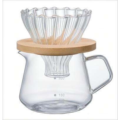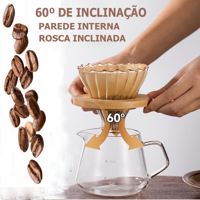 Conjunto de filtro de café para barista, coador em vidro no formato V60 02 e jarra de vidro. Filtro, base de madeira, estilo hario.