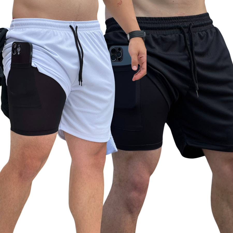 KIT 2 Short RUN 2 em 1 Dry Fit Bermuda Elastano Academia Masculina Treino Corrida