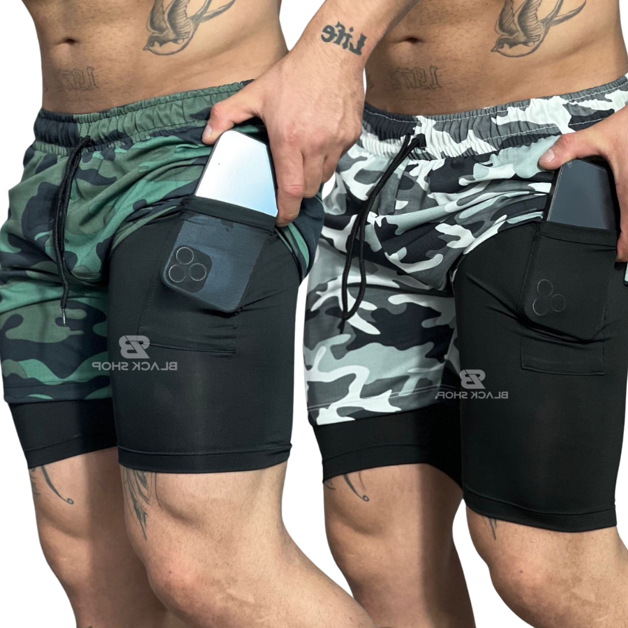 KIT 2 Short 2 em 1 Dry Fit CAMUFLADO Bermuda Compressão Academia Treino Corrida Com Elastano