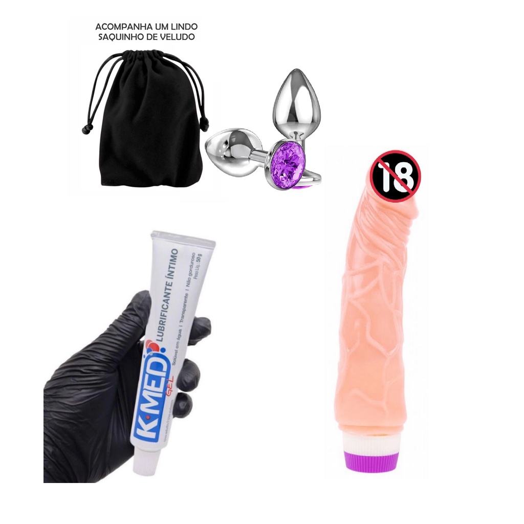 Kit Pênis Grosso Realístico Com Vibrador Integrado Multivelocidade + Kmed 50g + Plug Anal Tamanho P Com Joia Brilhante