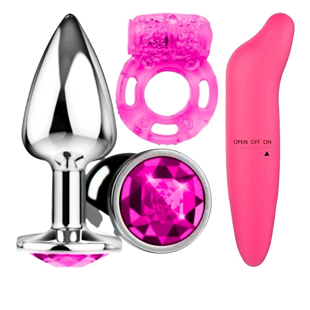 Kit Plug Anal P Inox Dilatador Anal com de Joia Cores Diversas + Vibrador e Estimulador Ponto G Feminino Liso + Anel Peniano Sex Shop