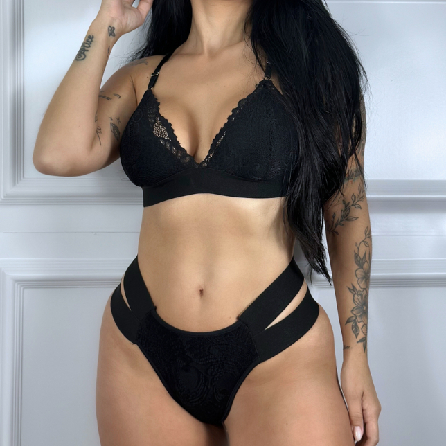 Conjunto Sexy de Renda Calcinha e Sutiã + Cinta Liga Lingerie Sensual Sem Bojo de Luxo