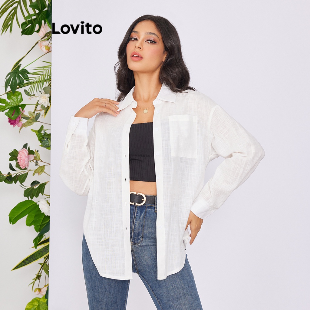 Lovito Blusa Básica com Botões Frontais e Bolsos para Mulheres LBE02037 (Branco)