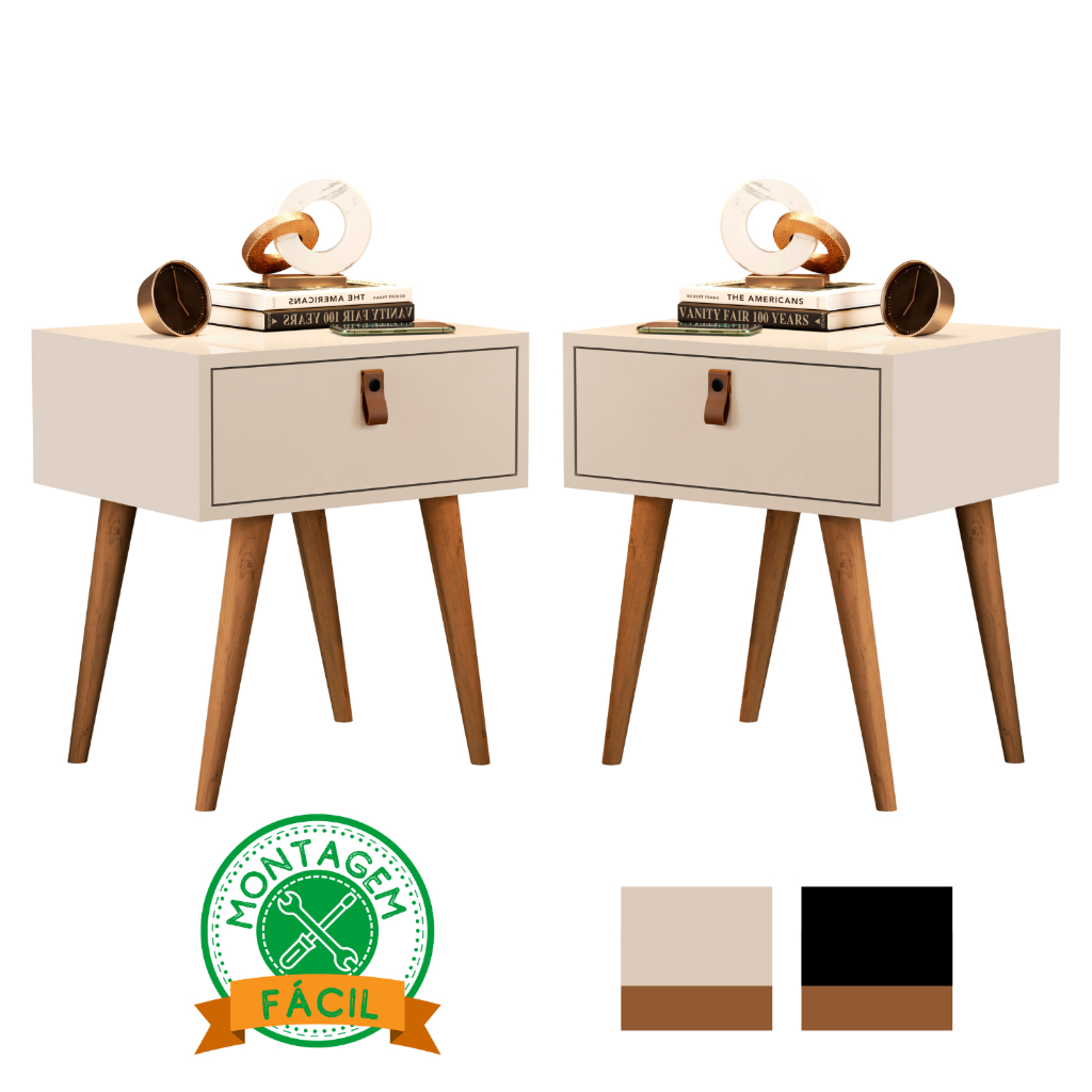 Kit 2 Mesa De Cabeceira Retrô Puxador em Couro Pés Madeira
