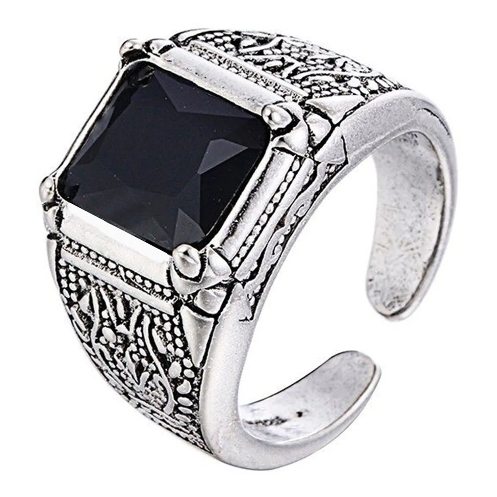 Anel Ajustável Com Pedra Preta Onix Masculino Regulável Comendador Motoqueiro Prata Prateado - APOC