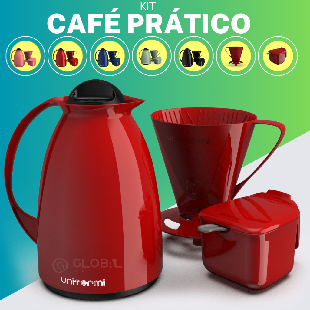 Kit Café Super Pratico Com Garrafa Térmica + Açucareiro Com Colher + Suporte para Filtro UNITERMI Varias Cores