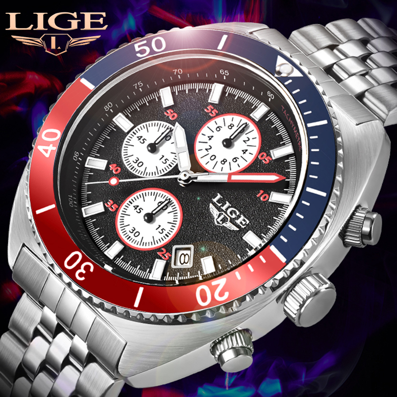 LIGE Original Relogio Moda Masculino Relógios Impermeáveis Marca Aço Inoxidável Esportivo Cronógrafo Quartzo Relógio de Pulso