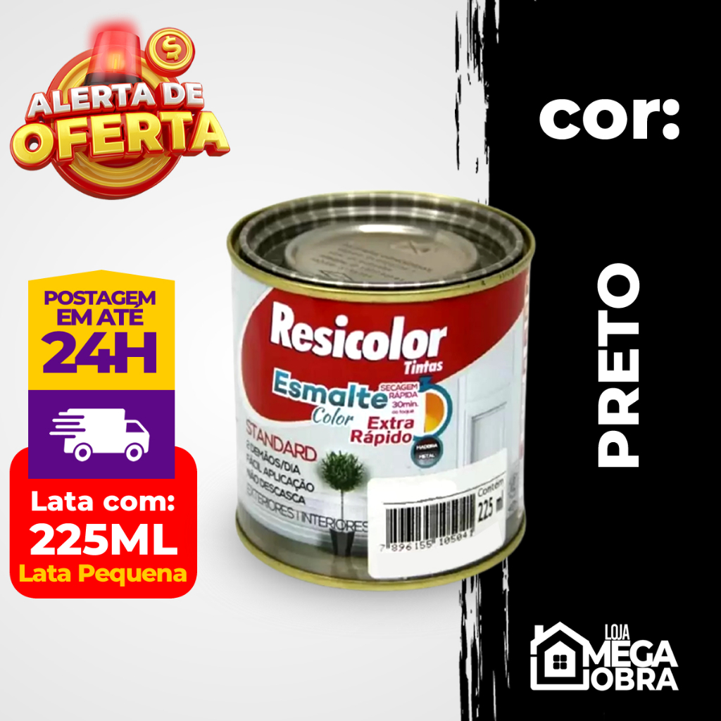 Tinta Esmalte Sintetico Brilho Standard para Madeira Ferro latão Interior e Exterior Cor Preto 225ml Resicolor