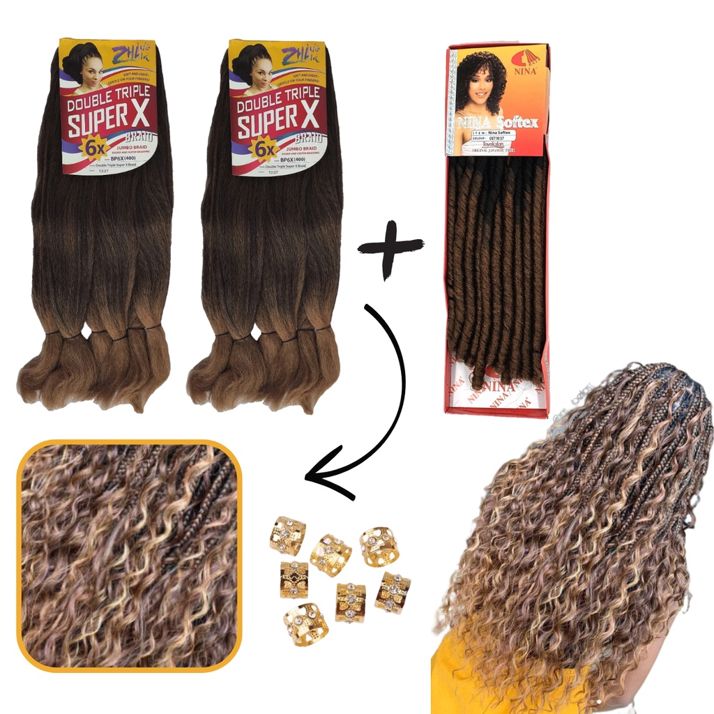 Kit 2 Cabelo Jumbo Gypsy Braids Super Hiper X Tranças Box Braid + Nina Softex Crochet Braids + Anéis de Enfeite