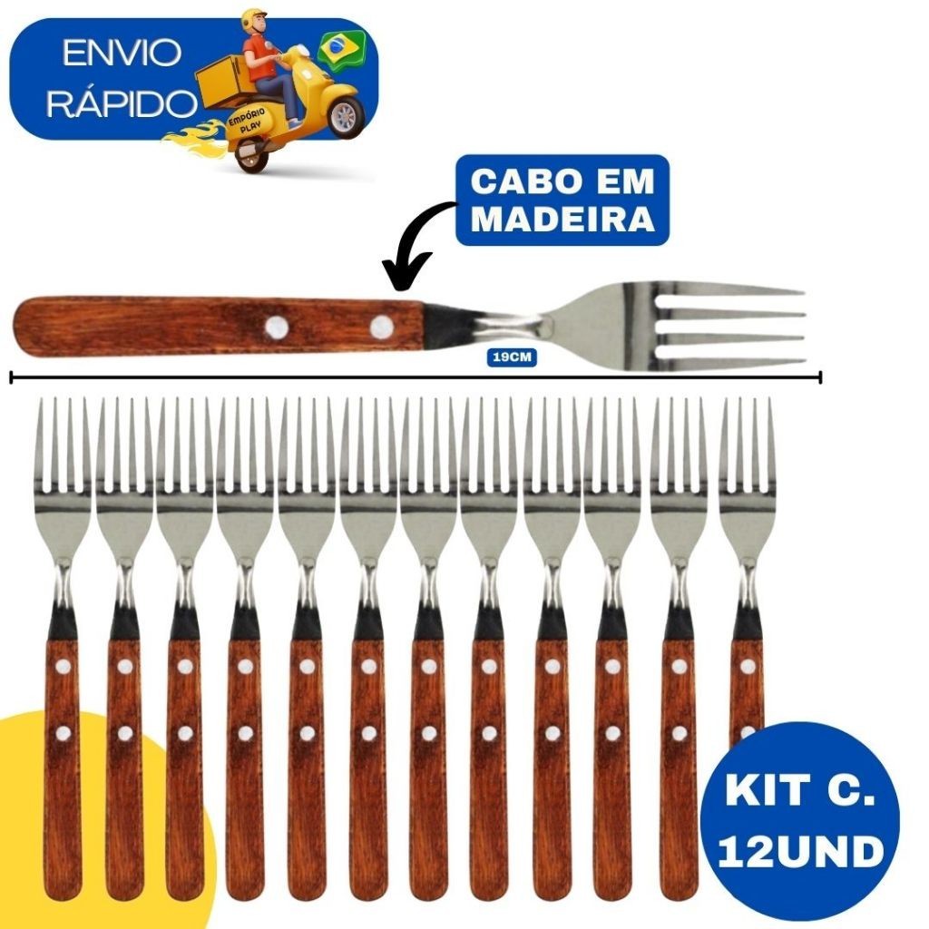 Jogo 12 Garfos Inox de Mesa Com Cabo Em Madeira Casa e Restaurante Churrascaria Churrasco Kit Jogo 1 Dúzia