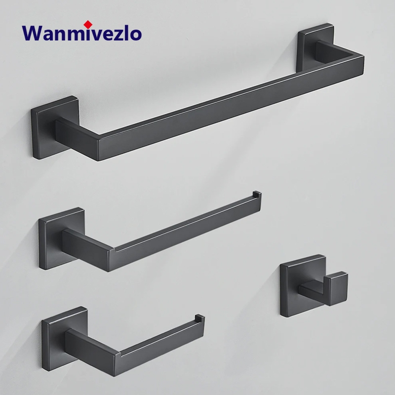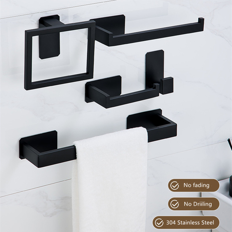 Toalheiro de banheiro Suporte de papel Toalha Anel Anel Casaco Gancho de Roupão Aço Inoxidável Preto Prata Acessórios de banheiro Conjunto de hardware Barra de toalhas Sem furação montada