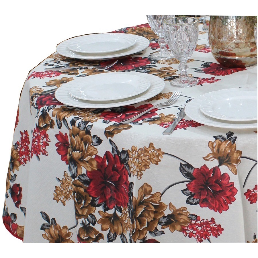 Toalha de Mesa Redonda 8 Lugares em Tecido Linhão Estampado 2,20m de Diâmetro Flores Vermelhas Sala/Jantar